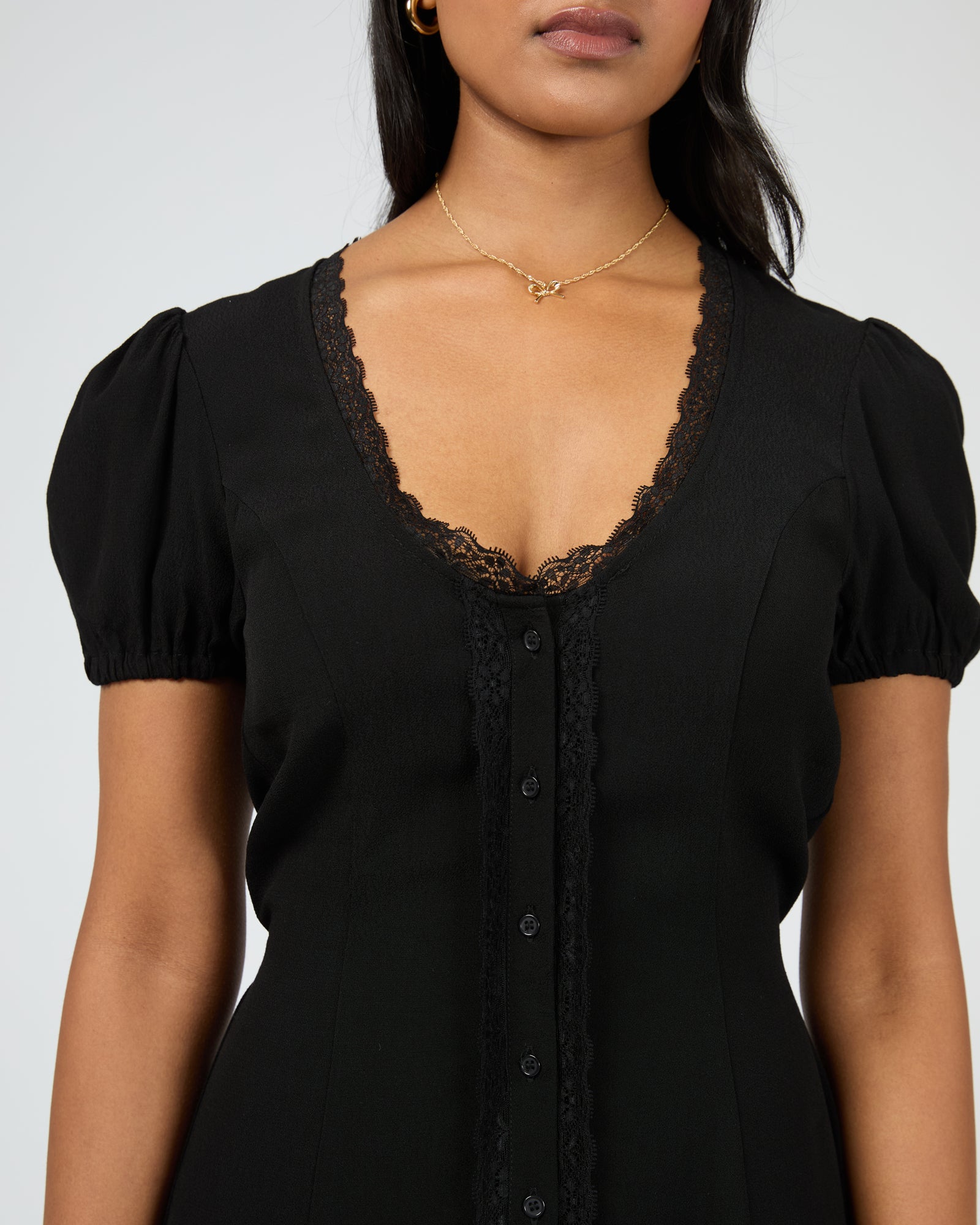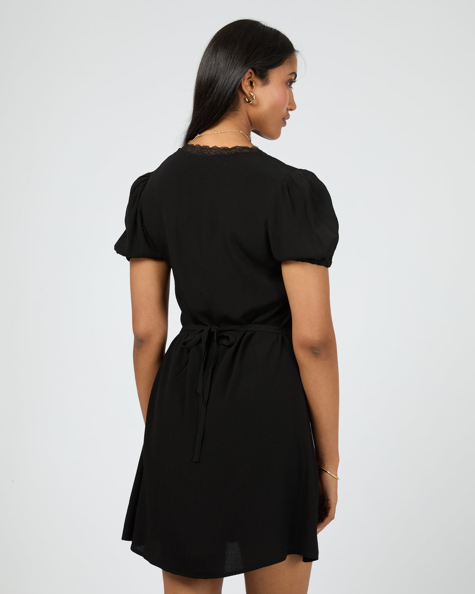 Here to make a statement – the Maybelle Mini Dress in black is a romantic and effortless wardrobe staple, designed to flatter and flow with ease. With functional buttons and a back tie, this piece can be worn exactly the way you like it. The Maybelle Mini Dress is perfect for day-to-night styling, bringing timeless elegance to casual or dressed-up summer occasions