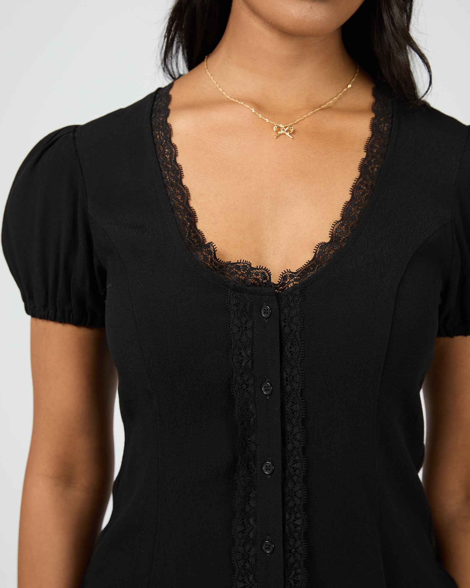 Elegant and summer-ready, the Maybelle Top in black combines romantic detailing with effortless wearability. Delicate lace trims the neckline and placket, while soft gathers and pouf sleeves add a feminine, flattering silhouette. Functional front buttons create subtle structure with a polished finish. The Maybelle Top is perfect for dressing up with skirts or trousers, or adding a touch of romance to casual summer outfits.