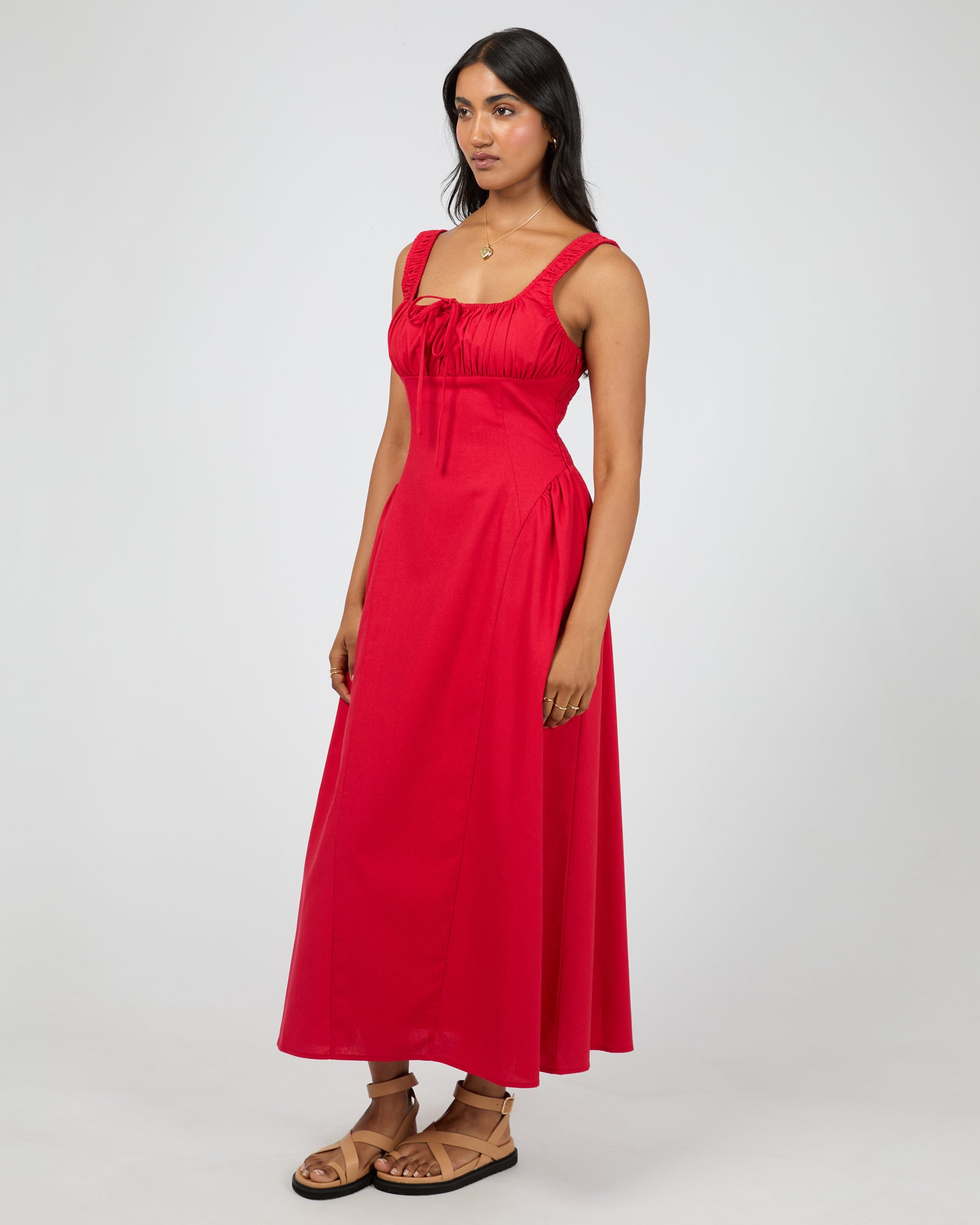 The Mavis Maxi Dress in red is a summer statement piece, blending ease with elevated detailing. The neckline features a functional tie detail, creating an adjustable fit, while elasticated armholes add subtle comfort, and the shirred back panel provides a flattering fit. Balancing effortless elegance with everyday versatility, the Mavis Maxi Dress will fit into every summer event with ease.